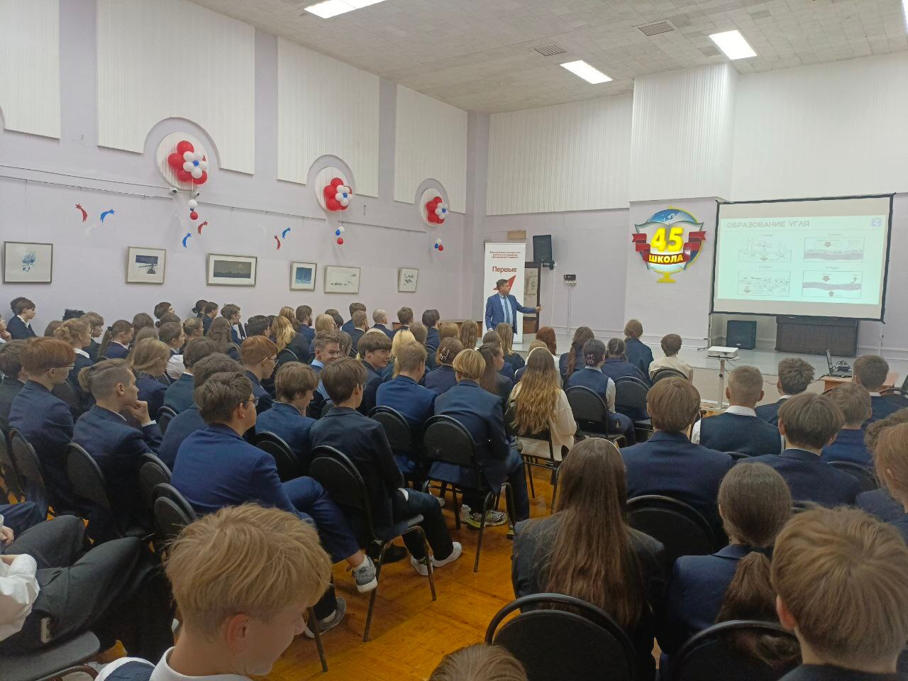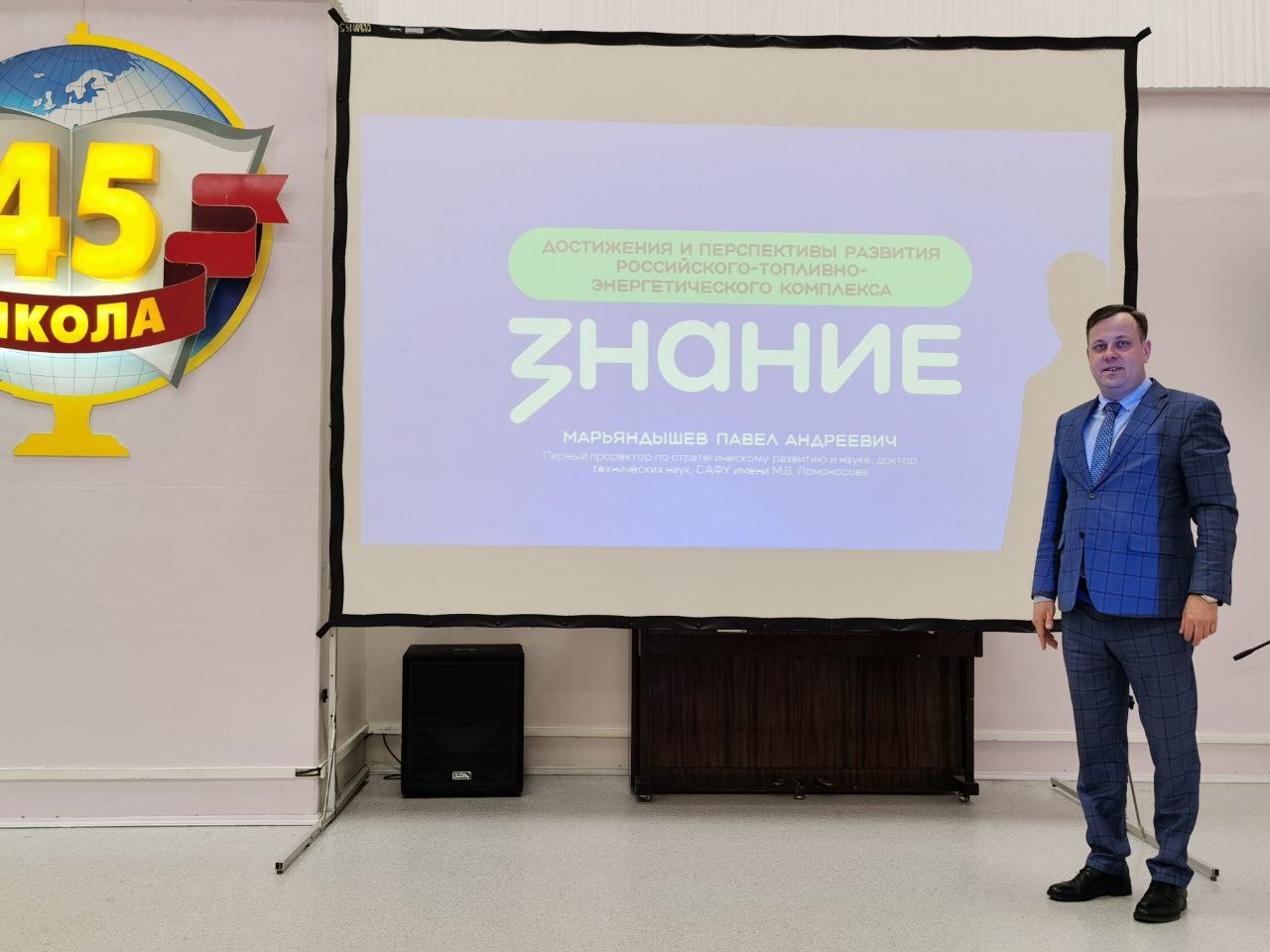 В рамках этого события к нам в школу был приглашен представитель Общества «Знание», первый проректор по стратегическому развитию и науке САФУ Марьяндышев Павел Андреевич. Он выступил перед учащимися 9-11 классов с лекцией «Достижения топливно - энергетического комплекса России». В интересной и доступной форме Павел Андреевич рассказал о внедрении современных технологий, освоении новых месторождений, о происхождении нефти, угля; о том, как устроены ТЭЦ, гидроэлектростанции. Подробно остановился на альтернативных источниках энергии: солнца, ветра, приливов. С интересом узнали учащиеся о том, как обеспечиваются энергией отдаленные территории, что такое замкнутый круг в производстве энергии. Благодарим Павла Андреевича и Общество «Знание» за интересную и познавательную встречу.