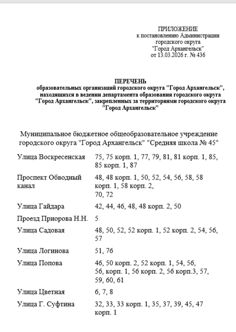 Перечень территорий, за которыми закреплено МБОУ СШ № 45 на основании Постановления Администрации городского округа «Город Архангельск» от 13.03.2026 г. № 436: