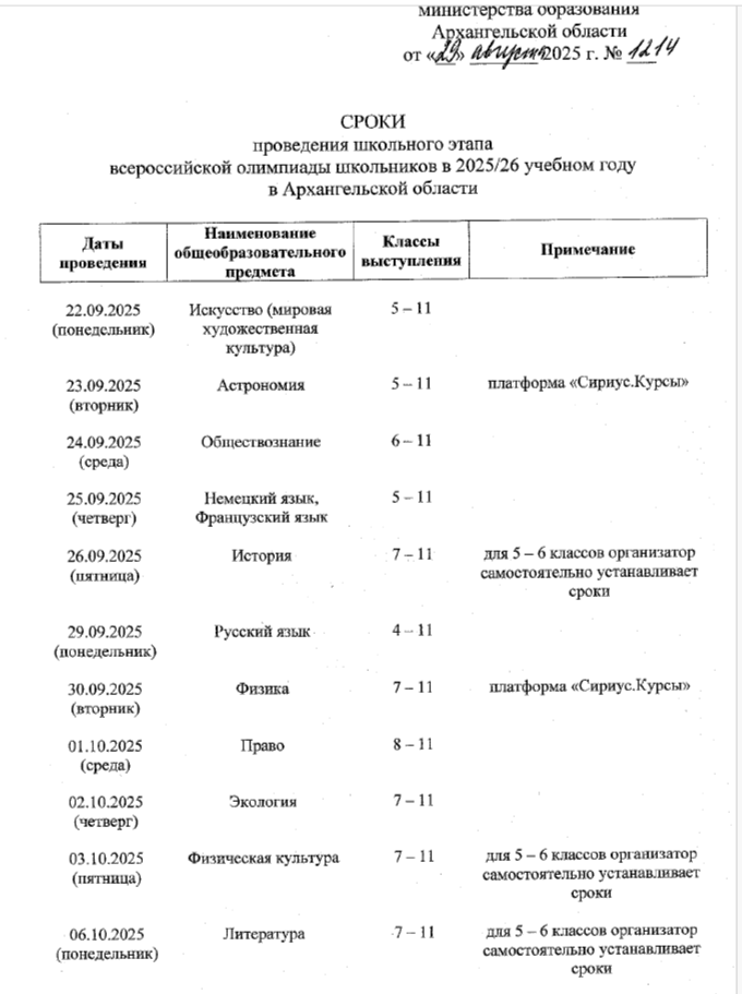 Распоряжение №1214 от 28.08.2025 “О сроках проведения школьного и муниципального этапов всероссийской олимпиады школьников в 2025-2026 учебном году”