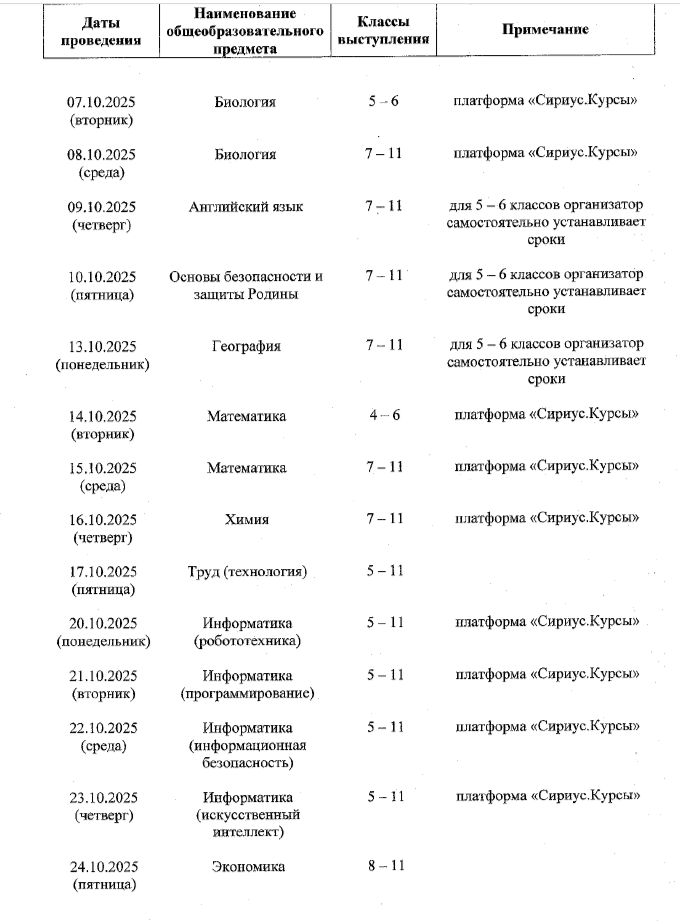 График проведения школьного этапа всероссийской олимпиады школьников на территории городского округа "Город Архангельск"
