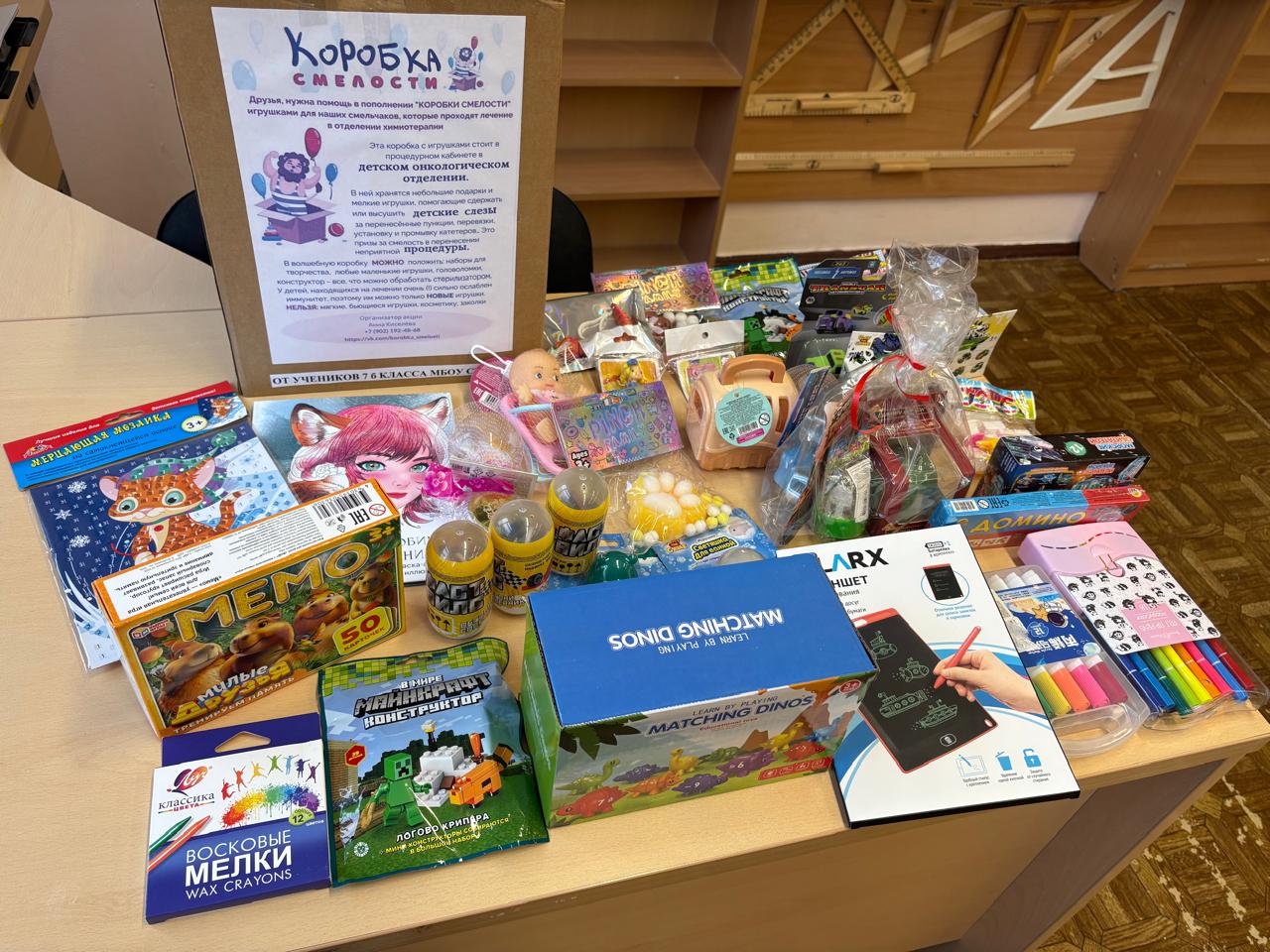 Обучающиеся 7 б класса присоединились к благотворительной акции «Коробка смелости». Надеемся, что игрушки и наборы для творчества поднимут настроение детям, находящимся на лечении в онкологическом отделении химиотерапии, придадут им сил.