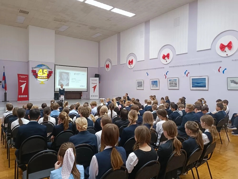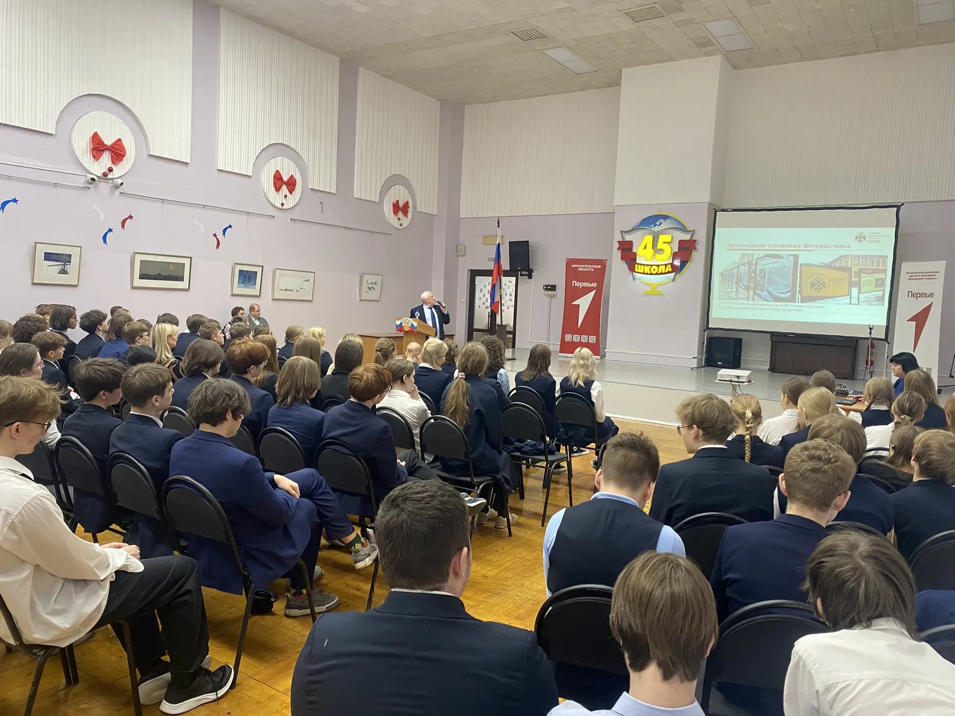 20 апреля 2026 года для учащихся МБОУ СШ 45 состоялся действительно интересный разговор о важном. Перед ребятами выступил советник губернатора Архангельской области, председатель областного отделения российского военно-исторического общества, координатор федерального партийного проекта "Историческая память" в Архангельской области Ковалев Сергей Михайлович. В марте 2026 года был подписан договор о создании профильного класса РВИО на базе МБОУ СШ 45, второго класса в Архангельской области. Сергей Михайлович на конкретных примерах рассказал ребятам о деятельности РВИО в Архангельской области, мероприятиях, которые проводятся для ребят. Так же в продемонстрировал видеоролики с мероприятий. Отдельно отметил важность сохранения исторической памяти, необходимость проявления уважения к истории своей страны.