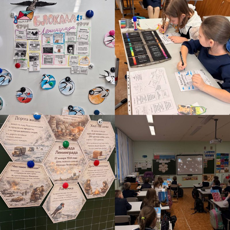 Акция «Блокадная ласточка» в школе. Учащиеся 3-х классов приняли участие в патриотической акции, посвященной блокаде Ленинграда. Они изготовили тематические поделки и плакаты из бумаги и картона. Под руководством классного руководителя ребята выступили у стендов школы, где узнали о подвигах жителей города. Акция направлена на воспитание гордости за предков, уважения к истории и формирование гражданской позиции.
