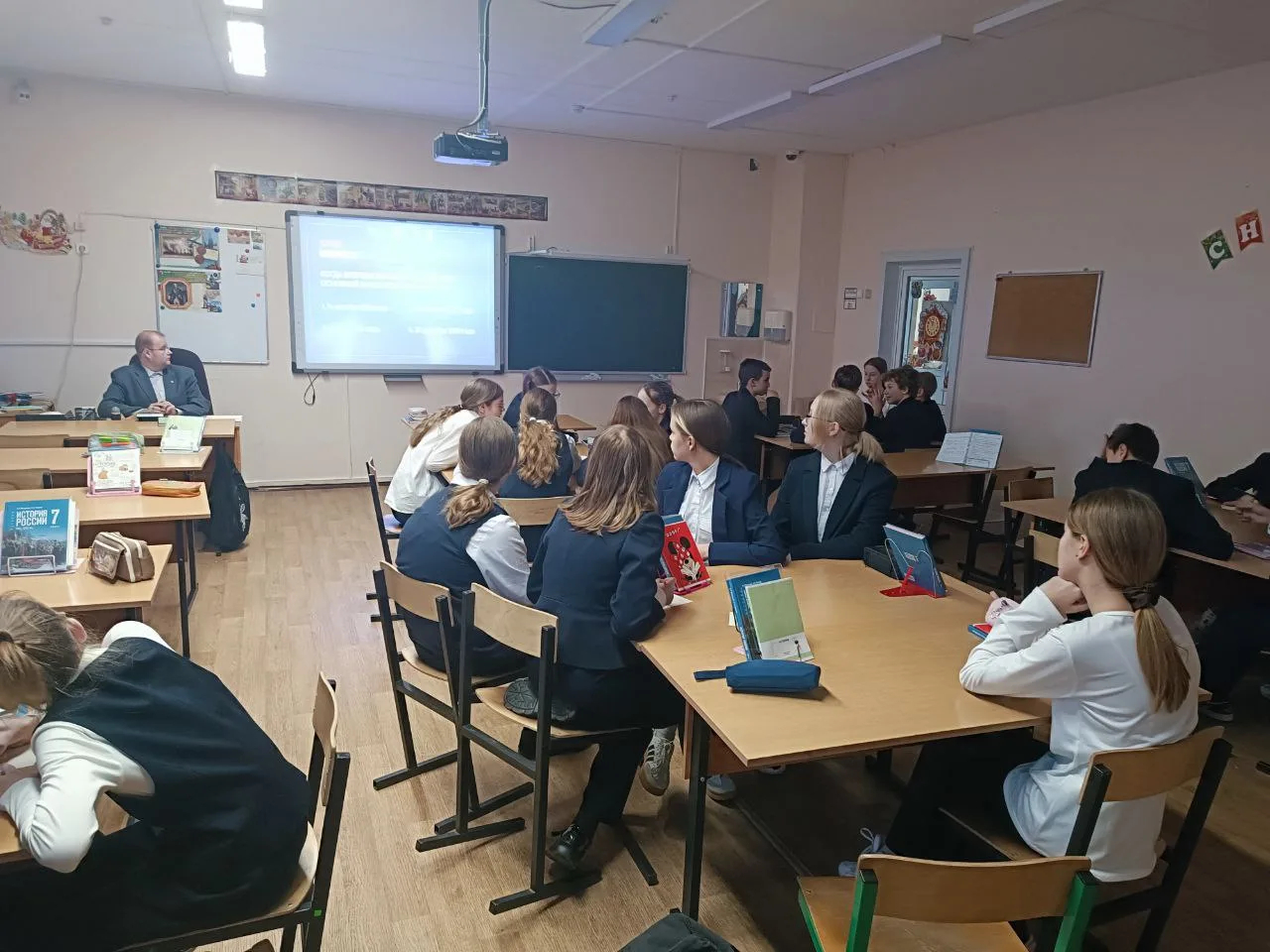В преддверии Дня Героев Отечества в школе прошёл урок «Разговоры о важном» с Героем нашего времени — Артёмом Николаевичем Ржевцевым, кавалером двух Орденов Мужества. Он рассказал ученикам 7-8 классов о службе в зоне СВО, наградах и трудностях на передовой. Встреча позволила ребятам понять, что героизм — это поступки современников, а не только страницы учебника. Мы благодарим Артёма Николаевича за мужество и урок патриотизма.