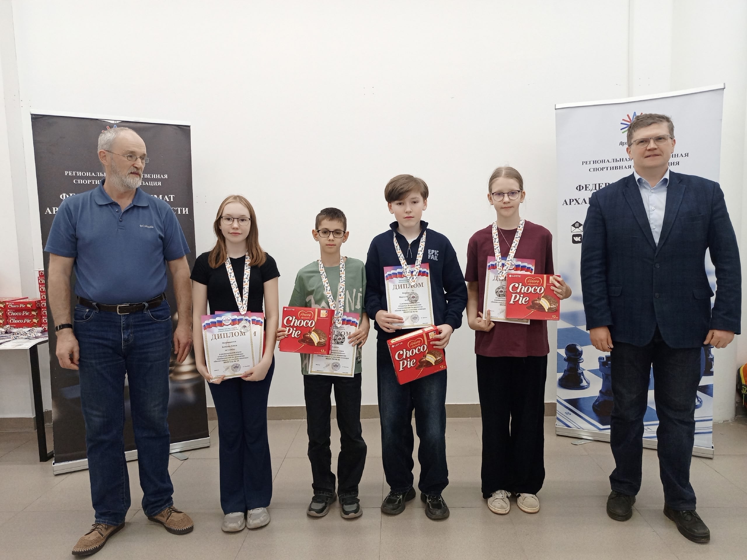 В период с 03 по 05 апреля в ТЦ «Соломбала-Молл» прошел региональный этап Всероссийского Первенства по шахматам «Белая Ладья». Команда 45-й школы в составе: Бобкова Алеся (капитан), Золотой Константин, Мирошниченко Захар, Лапина Елизавета, Киселева Софья (запасной игрок), Володина Арина (запасной игрок) в упорной борьбе завоевали серебряные медали.