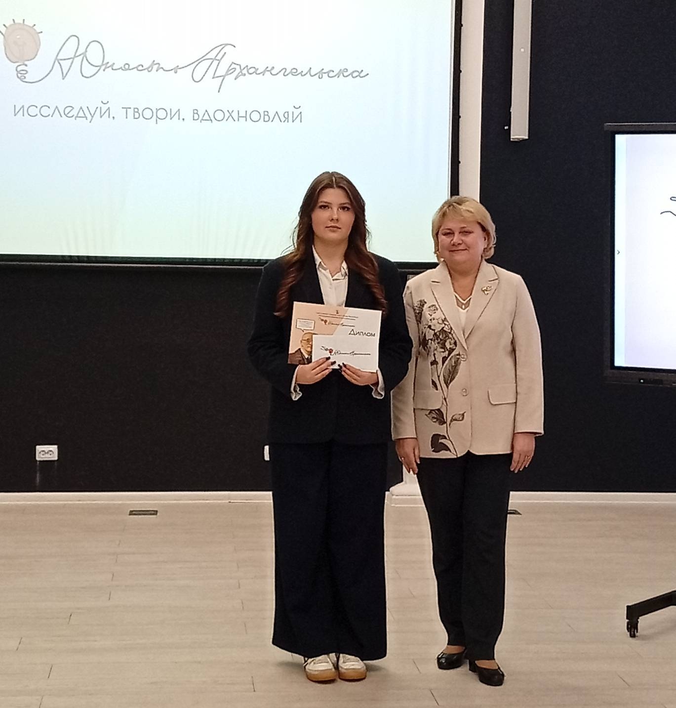 6 марта в IT - парке САФУ состоялось пленарное заседание XXVI городской конференции " Юность Архангельска". Победители исследовательских работ по разным направлениям получили награды из рук директора департамента образования Базановой С.О. От нашей школы победителем в секции "Искусство" стала Ерыкалова Алеся, ученица 11А класса. Под руководством учителя МХК Новожиловой Бэлы Борисовны она написала и защитила работу об архитектуре города Архангельска, сравнив ее с прошлой архитектурой, представив замечательный альбом фотографий. Поздравляем Алесю и ее руководителя с победой!